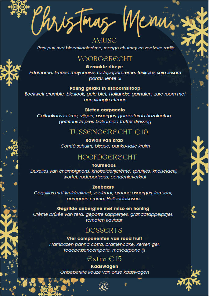 Wij nodigen u van harte uit om op eerste Kerstdag, 25 december te komen genieten van ons sfeervolle 3-gangen kerstdiner, vol met culinaire verassingen en winterse smaken. Laat u verwennen door onze chef en geniet van een onvergetelijke avond in feestelijke sfeer. Het menu is te reserveren voor €59,50 per persoon.